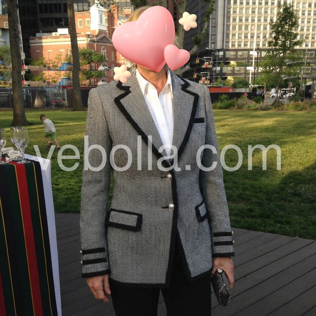 Chic Herringbone Blazer with Black Trim and Classic Double Breasted Design