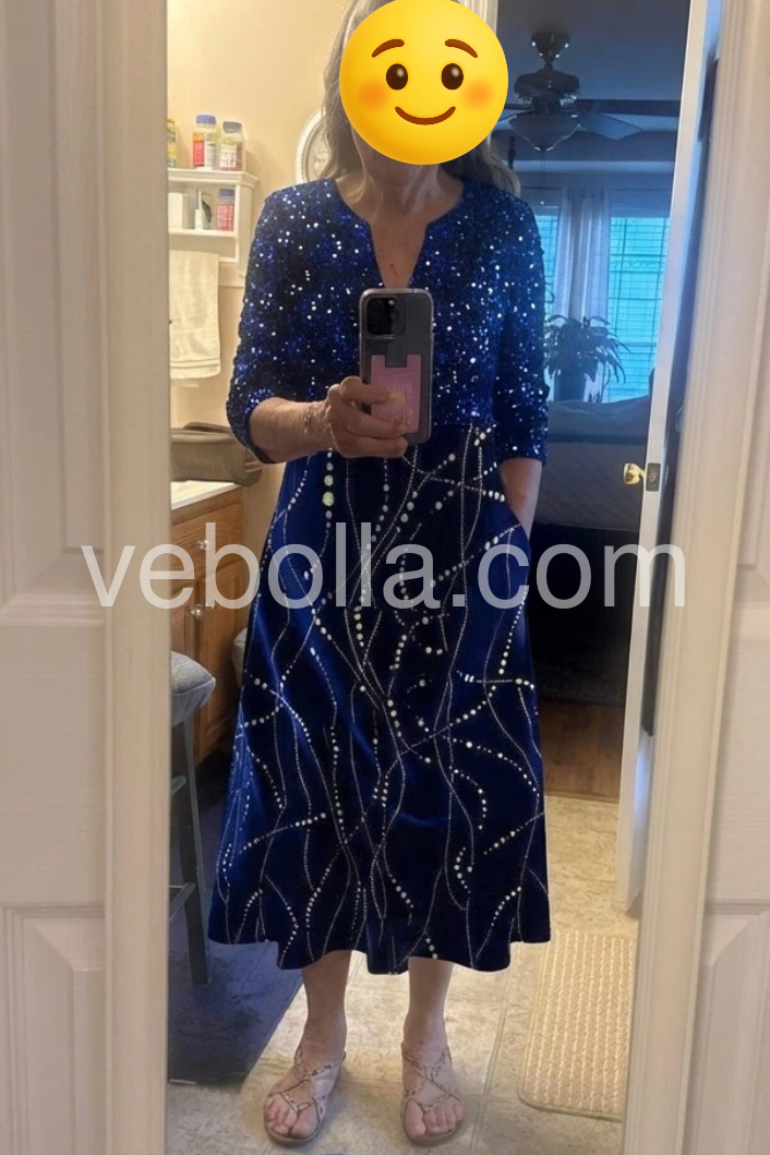 A royal blue and cobalt shade intermingle on this long summer dress covered in white line streaks and dots reminiscent of constellations. A button-front round collar v-neckline, three-quarter length sleeves, and flared midi dress silhouette keep it versatile, finished with side pockets. Pair it with flats, heels, a black or brown leather jacket, and hoops. Machine wash cold tumble dry low to medium heat. Iron if needed or lay flat to dry.