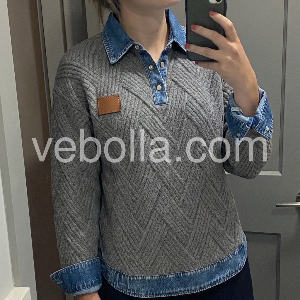 Elevate your casual wardrobe with this sophisticated grey herringbone knit sweater, featuring a distinctive denim collar that bridges the gap between refined knitwear and relaxed styling. The herringbone texture adds visual depth and dimension, while the contrasting denim collar provides a contemporary edge perfect for layering or wearing standalone. Crafted for versatility, this piece transitions seamlessly from weekend wear to smart-casual settings, offering both comfort and polished appeal.