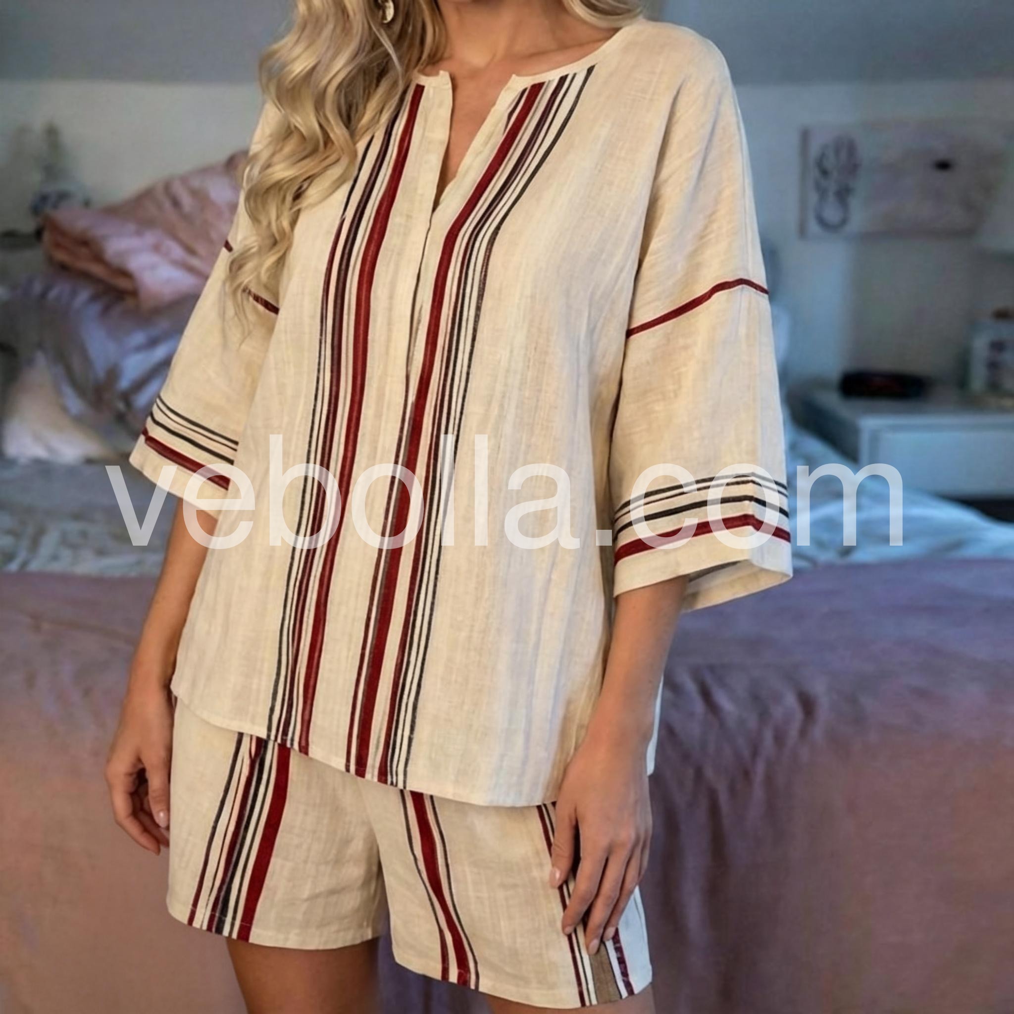 This sophisticated two-piece set features a flattering V-neck design complemented by classic striped patterns. Engineered for optimal comfort without sacrificing style, the coordinated pieces offer versatile styling options for various occasions. The thoughtfully constructed silhouette provides a polished appearance while maintaining ease of movement throughout the day.