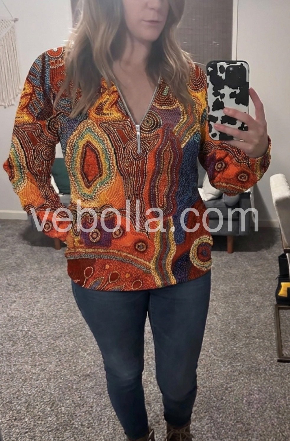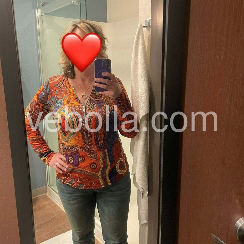 Zip it up with this autumn color casual top, featuring red, orange, blue, and yellow geometric swirls and bead print patterns. The long fitted sleeves, zippered plunging v-neckline, and waist-length silhouette give this laid-back top just the right amount of detail. Finish your look with silver or gold jewelry, jeans, and a cami underneath. Machine wash cold tumble dry low to medium heat. Iron if needed or lay flat to dry.